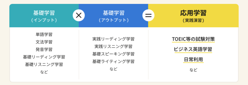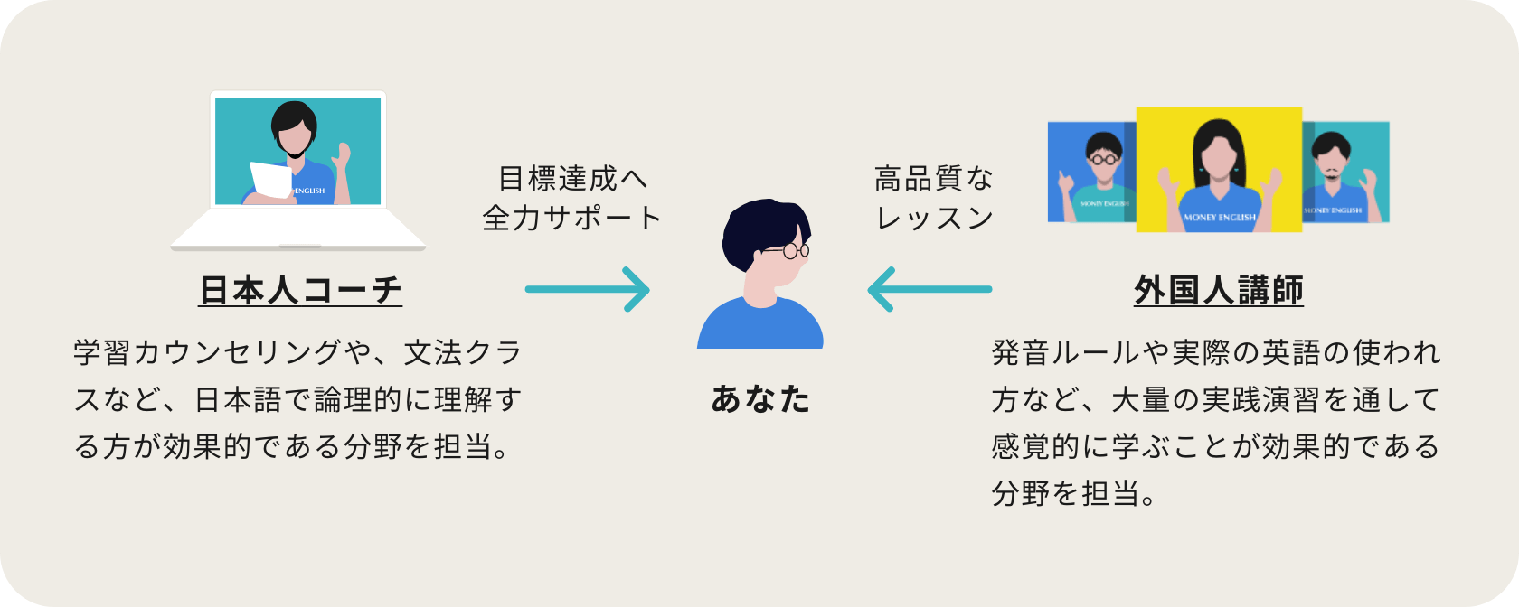 学習カウンセリングや文法クラスなど、日本語で論理的に理解する方が効果的である分野は日本人コーチが対応。発音ルールや実際の英語の使われ方など、大量の実践演習を通して感覚的に学ぶことが効果的である分野は外国人講師が対応します。一般的なサービスでは英会話やコーチングなど必要な機能がバラバラになっていることが多いですがマネーイングリッシュは網羅されているため学習効率も高く他サービスの卒業生にもよく選ばれています。