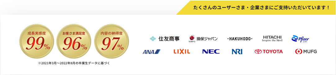 サービス提供開始以来、多くのお客さまと・日本を代表する企業さまから選ばれてご支持いただいています。「価格以上にサービス内容が充実しており、コーチのサポートも熱心なので入会してよかった」とのお声をいただくことが多いです。高い成長実感度と満足度もマネーイングリッシュの特徴です。