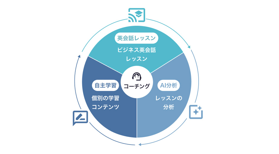 日本人講師から選抜されたプロコーチが、AIレッスンレポートや学習プランに沿って、月4回、1回25分のコーチングを実施します。学習の悩み解消や改善点の提案など、丁寧にアドバイスします。学習進捗の管理、課題の把握と解消、モチベーションの向上、習慣化のサポートなど一人ひとりに合わせて伴走します。ライフスタイルの変化に合わせて、学習プラン、スケジュールの再検討も柔軟に対応いたします。