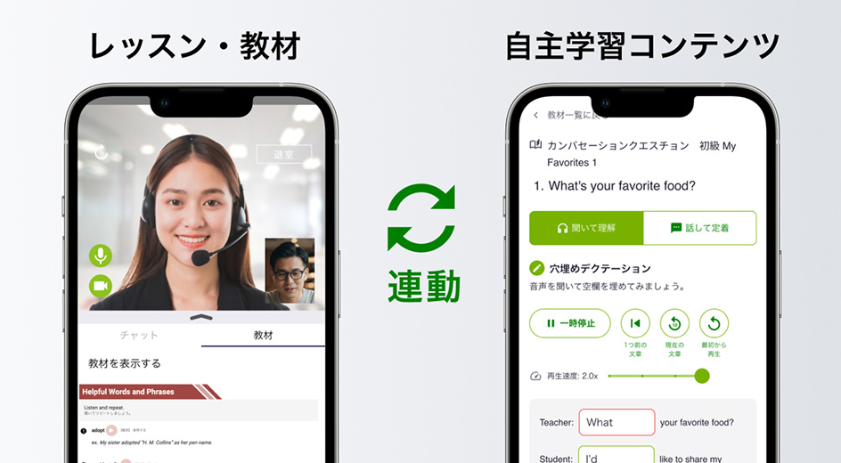 レッスンや教材の内容と連動した、個別の予習・復習コンテンツ。学んだことは次のレッスンですぐに実践に繋がります。リスニング、ディクテーション、リピーティング、オーバーラッピング、シャドーイングで学ぶことができます。聞いて理解し、話して確認できるので、効率的に予習復習をしていただけます。