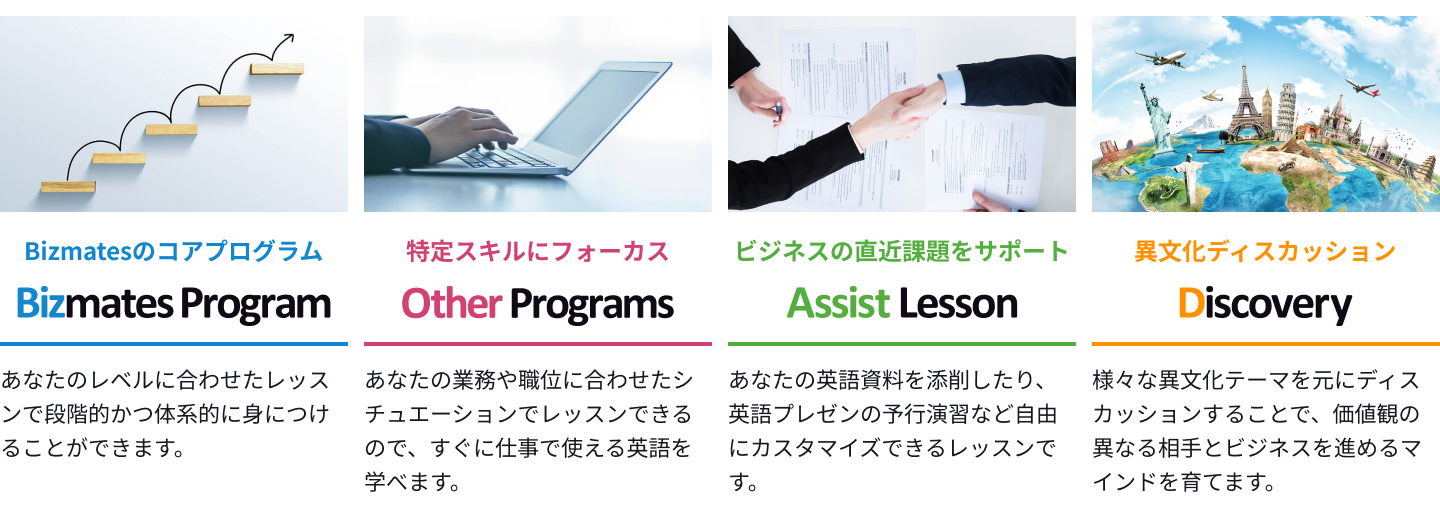 Bizmatesでは、英語学習の初心者から上級者まで様々なレベルの方に対応できるプログラムをご用意しております。