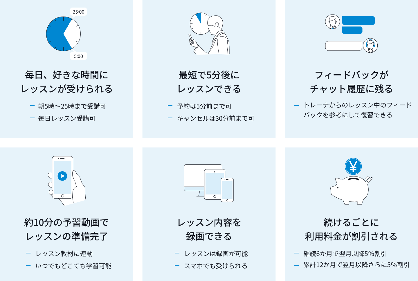 | 1レッスンの時間 | 25分 | 支払い方法 | クレジットカード/PayPal |