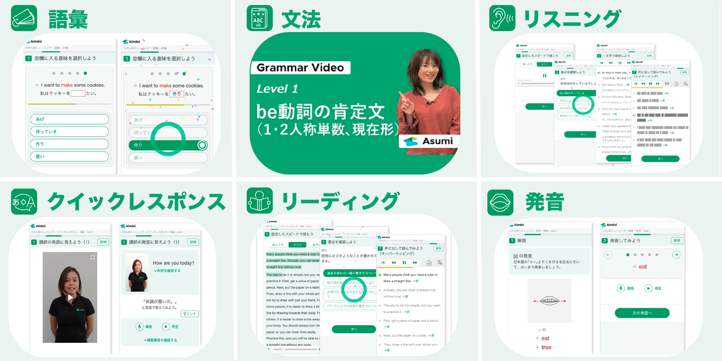 24時間使えるスキル別トレーニングでは、語彙・文法・リスニング・リーディング・クイックレスポンス・発音を集中的にトレーニングできます。